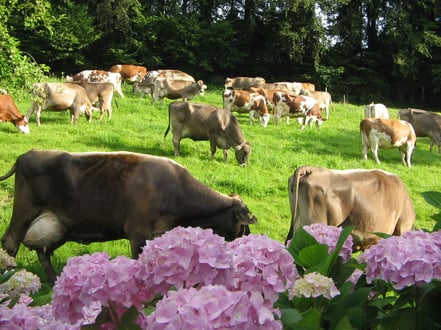 Die gemischte Swiss Fleckvieh-, Red Holstein- und Braunviehherde haben einen modernen Laufstall. Sie können sich im Winter gross bewegen, im Auslauf jedes Wetter fühlen, und bei der